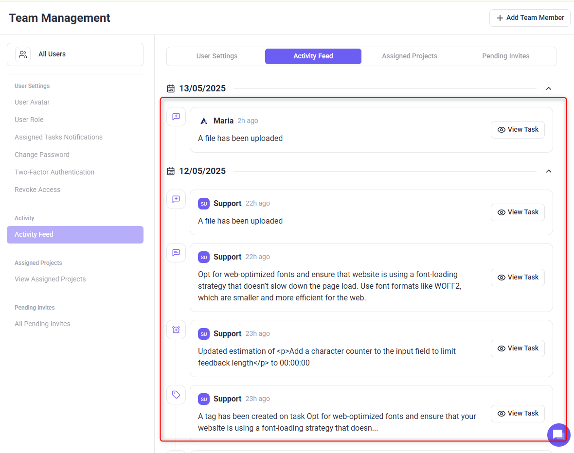 • See all actions (task creation, updates, completions, comments, and feedback).
