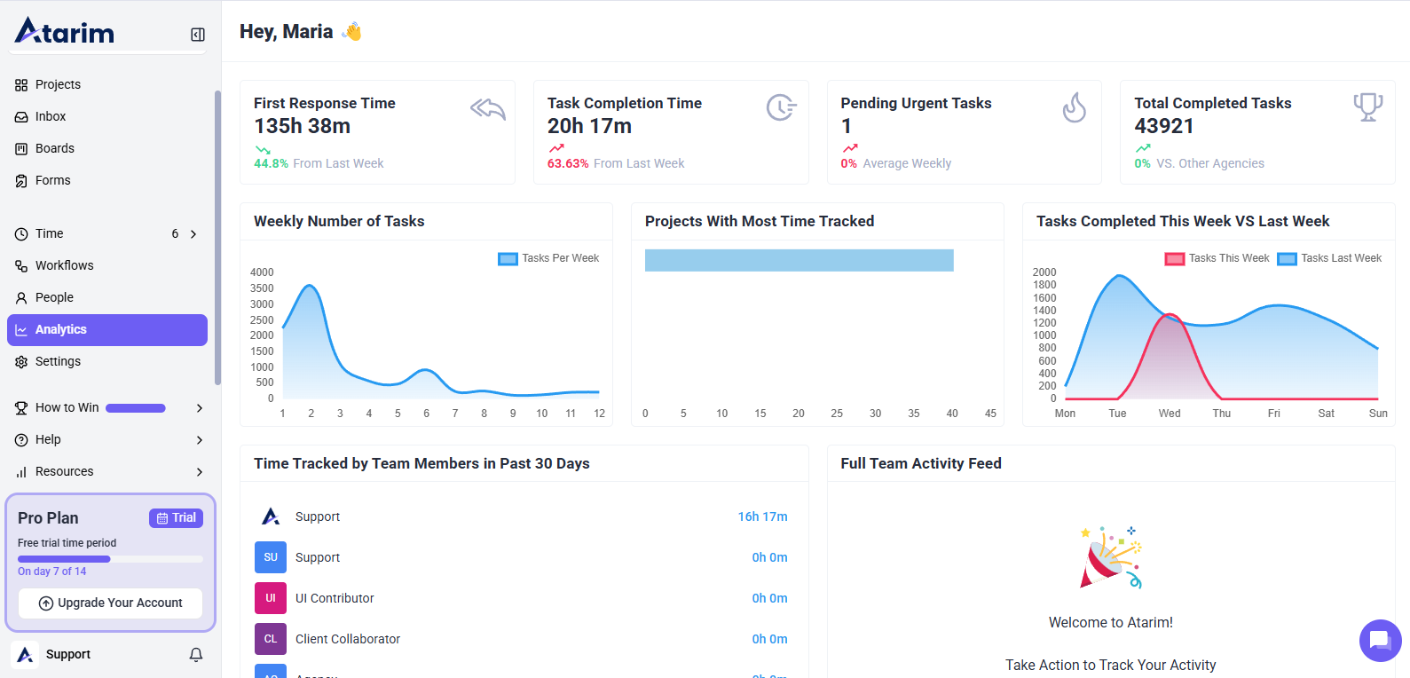 Atarim provides a comprehensive set of tools for tracking team performance and project progress. The Analytics Page offers project-level insights like task completion rates, time tracking, and task urgency, while the Activity Feed on the People Page provides granular, real-time updates on individual contributions. Together, these tools ensure accountability, optimize workflow, and keep projects on track.