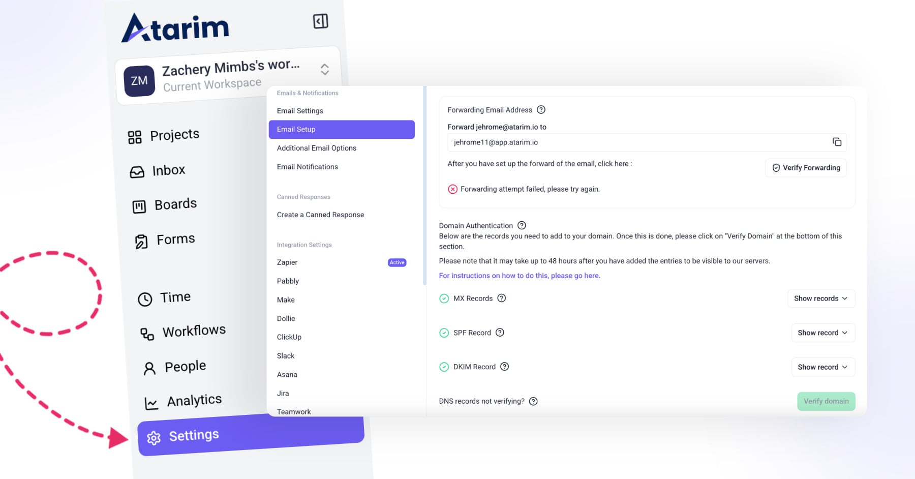 To ensure smooth email communication through app.atarim.io, you need to verify your domain by adding DNS records. This authentication process improves email deliverability, prevents spoofing, and allows you to customize your tracked links.