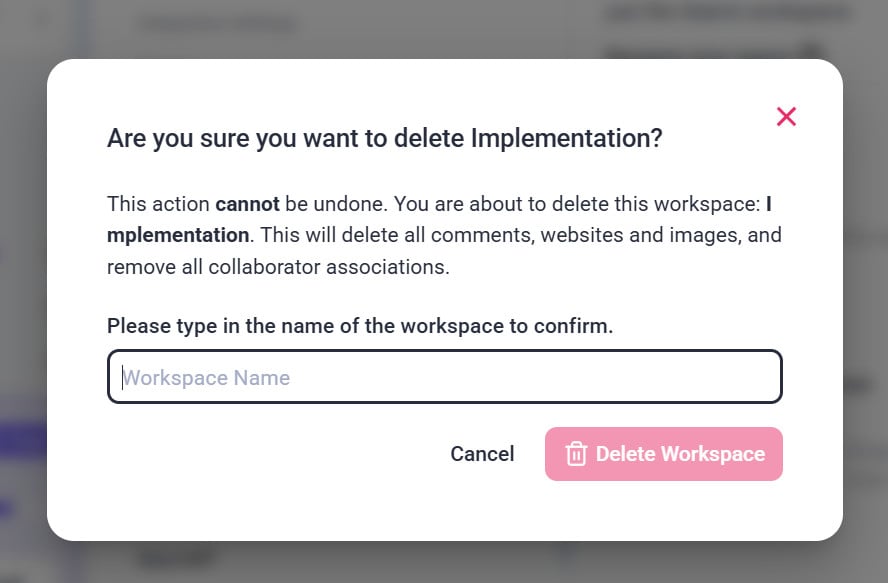 A warning message will appear, stating that deleting the workspace will remove all related data, projects, comments, and collaborator associations.