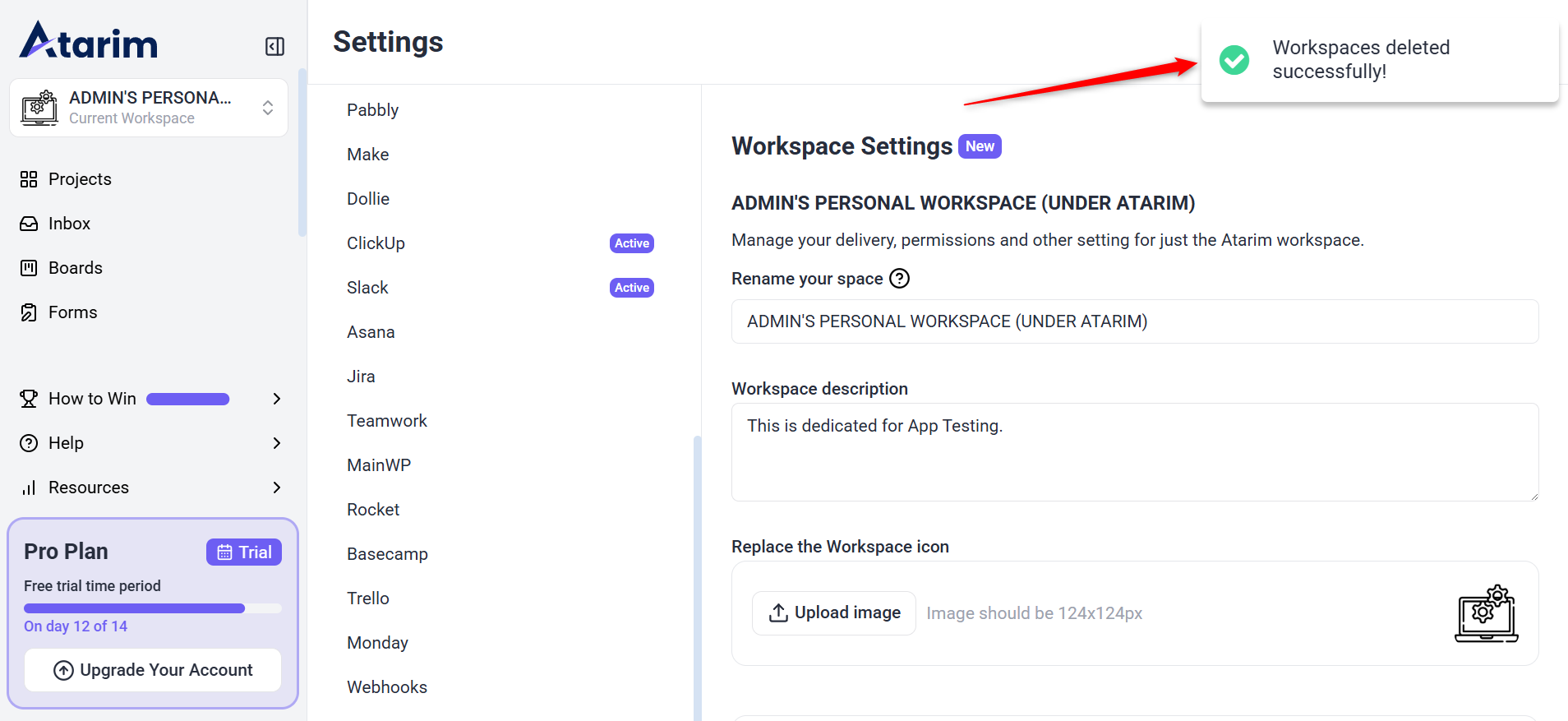 Atarim requires confirmation before permanently deleting a workspace.