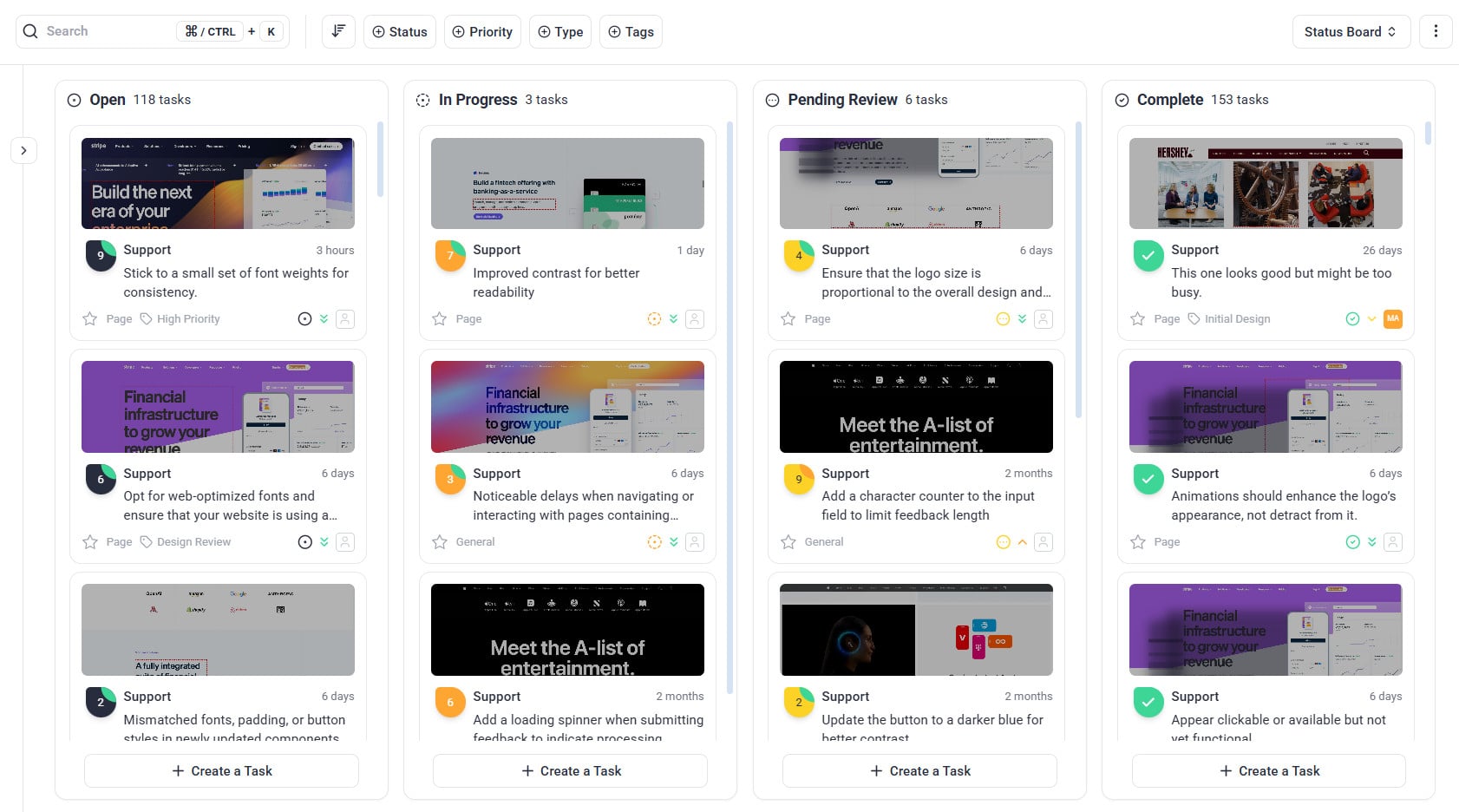 Atarim’s Kanban Board is a highly visual and intuitive task management tool designed to help teams efficiently track progress, manage workflows, and enhance collaboration. Featuring real-time updates, advanced filtering, drag-and-drop functionality, and deep task customization, it ensures that every team stays aligned and productive.