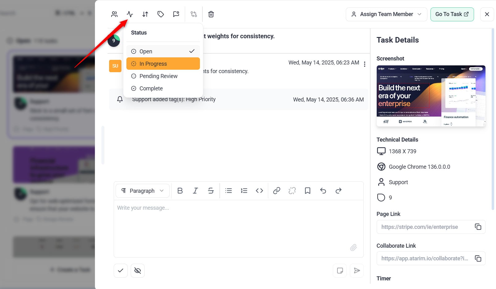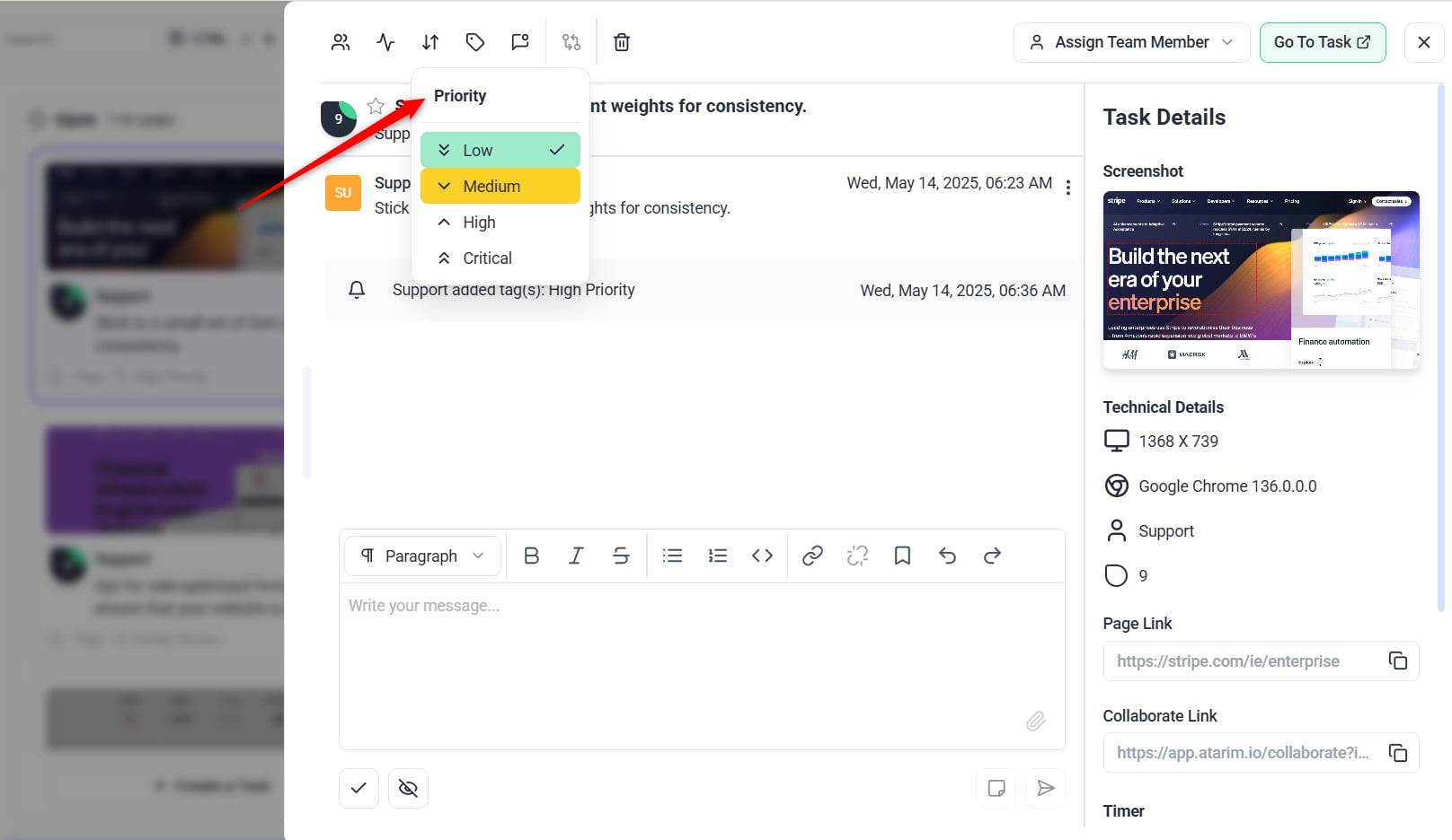 - Technical Details: Displays browser, OS, screen size, and task creator.