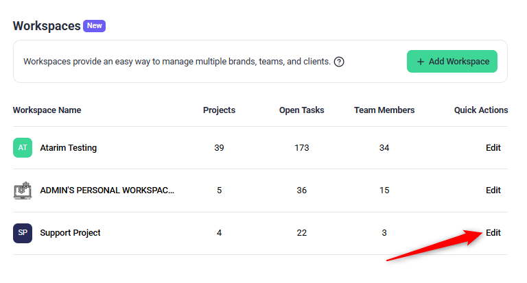 - From the Workspace Settings tab, find the workspace you want to edit or delete.