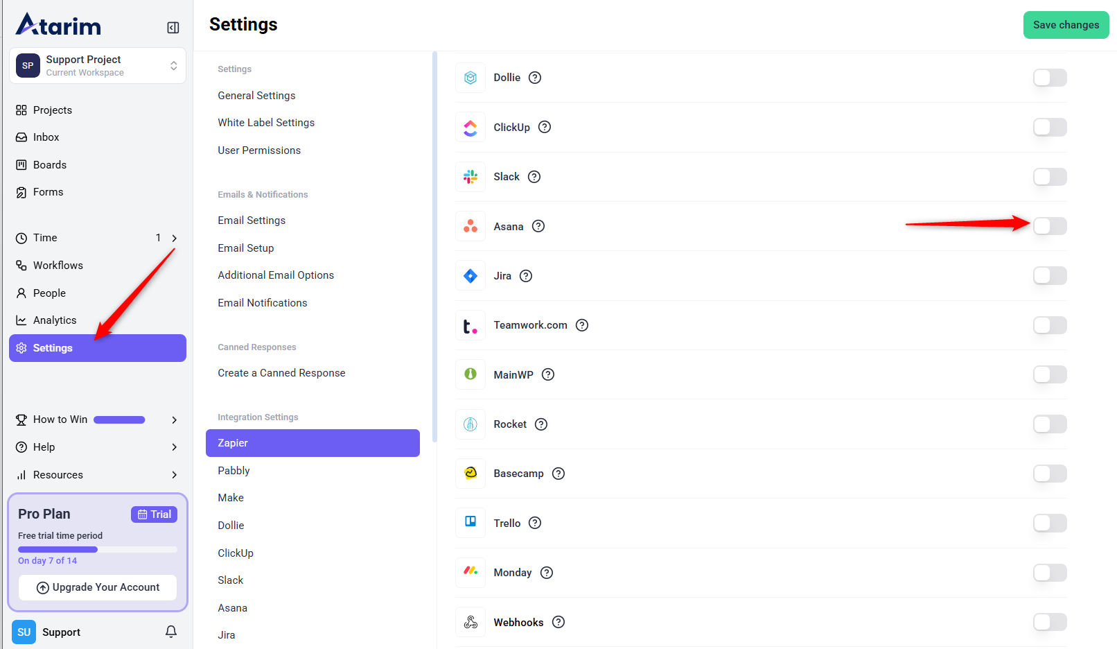 3. Locate the Asana integration in the list of supported platforms and toggle the switch to enable it.
