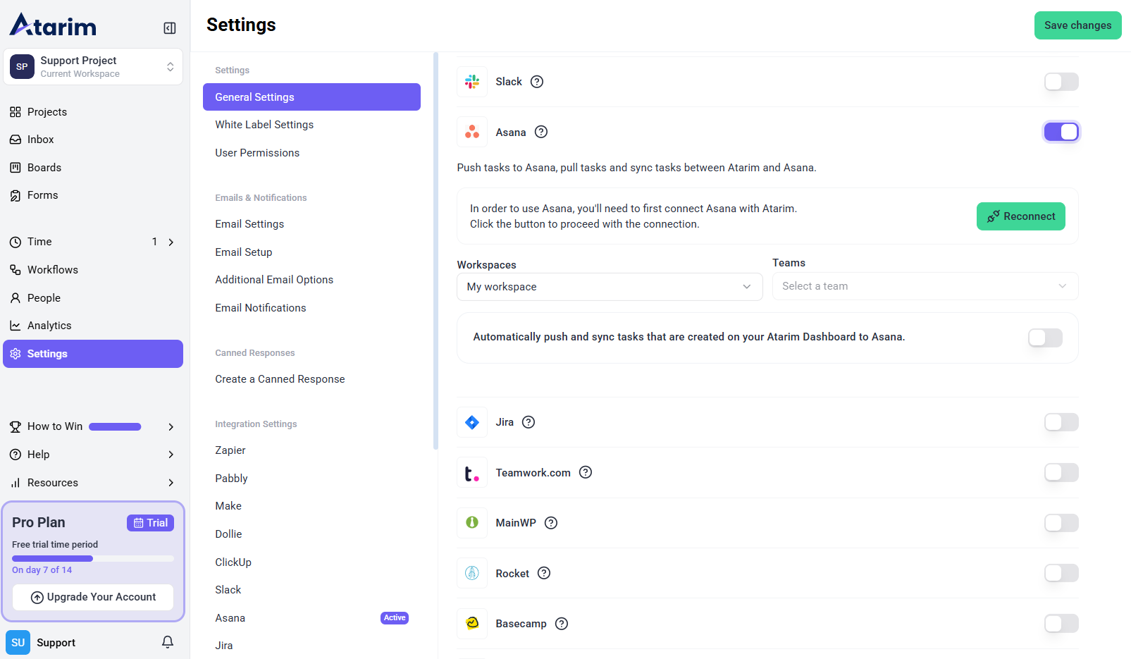 Tip: If you see a Reconnect button in the Asana integration settings, it means your Asana account is successfully connected.