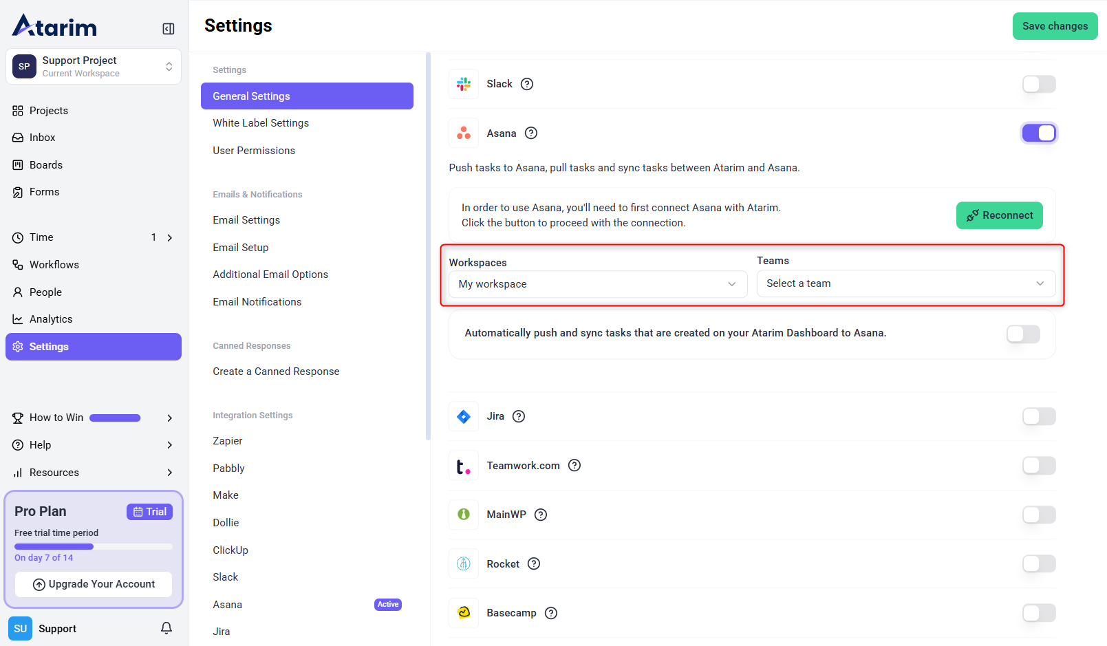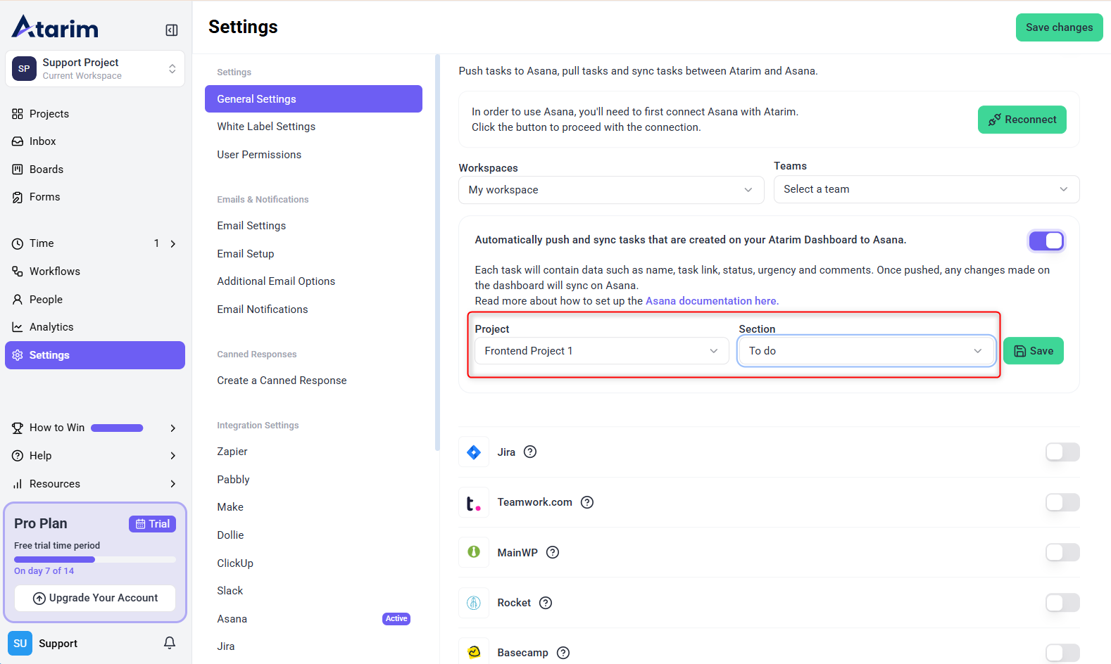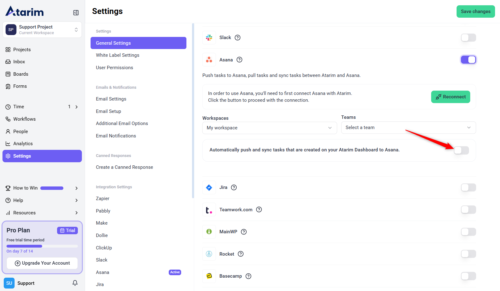1. In the Asana Integration Settings, toggle the option to enable Automatic Task Pushing.