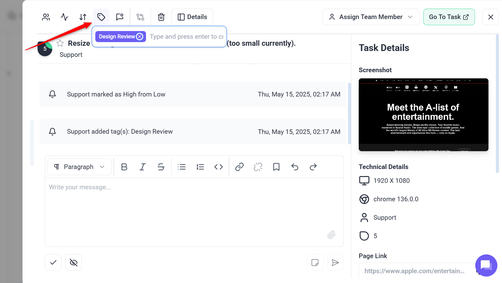 - Assign priority levels (High/Medium/Low) to tasks using the Task Management tool.