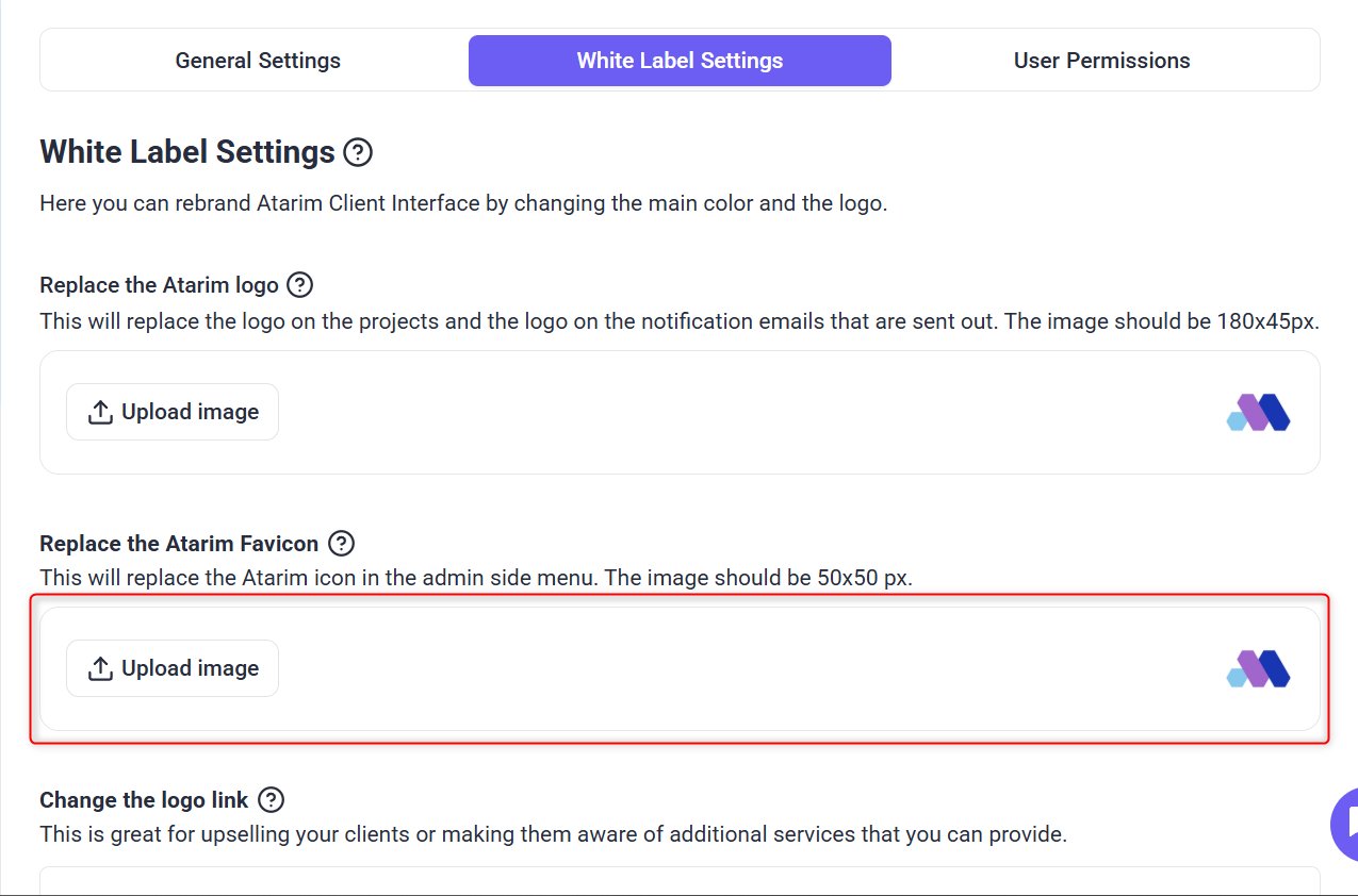 - In White Label Settings, upload a 50×50 pixel image under the “Favicon” section.