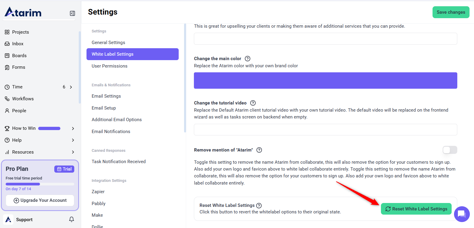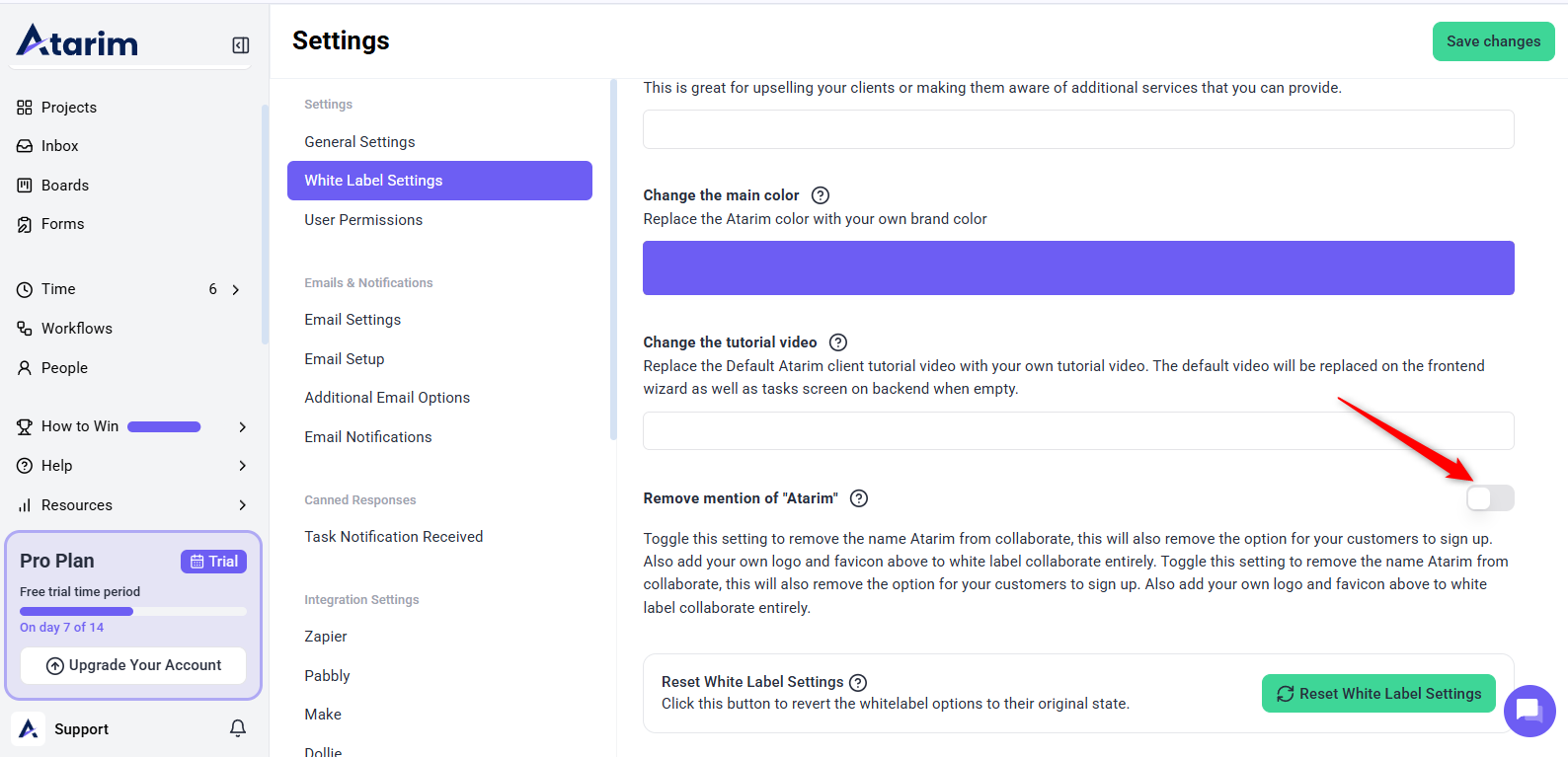 - Toggle on “Remove Mentions of Atarim” in the White Label Settings.
