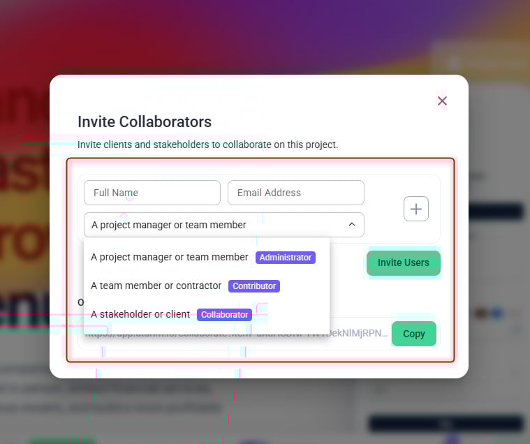 - Add the client’s name and email address in the invite modal.